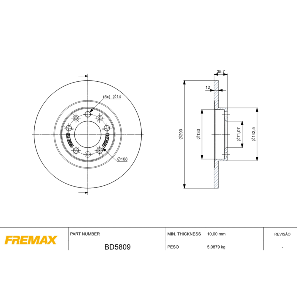 DISCO DE FRENO SÓLIDO TRASERO FREMAX - BD5809